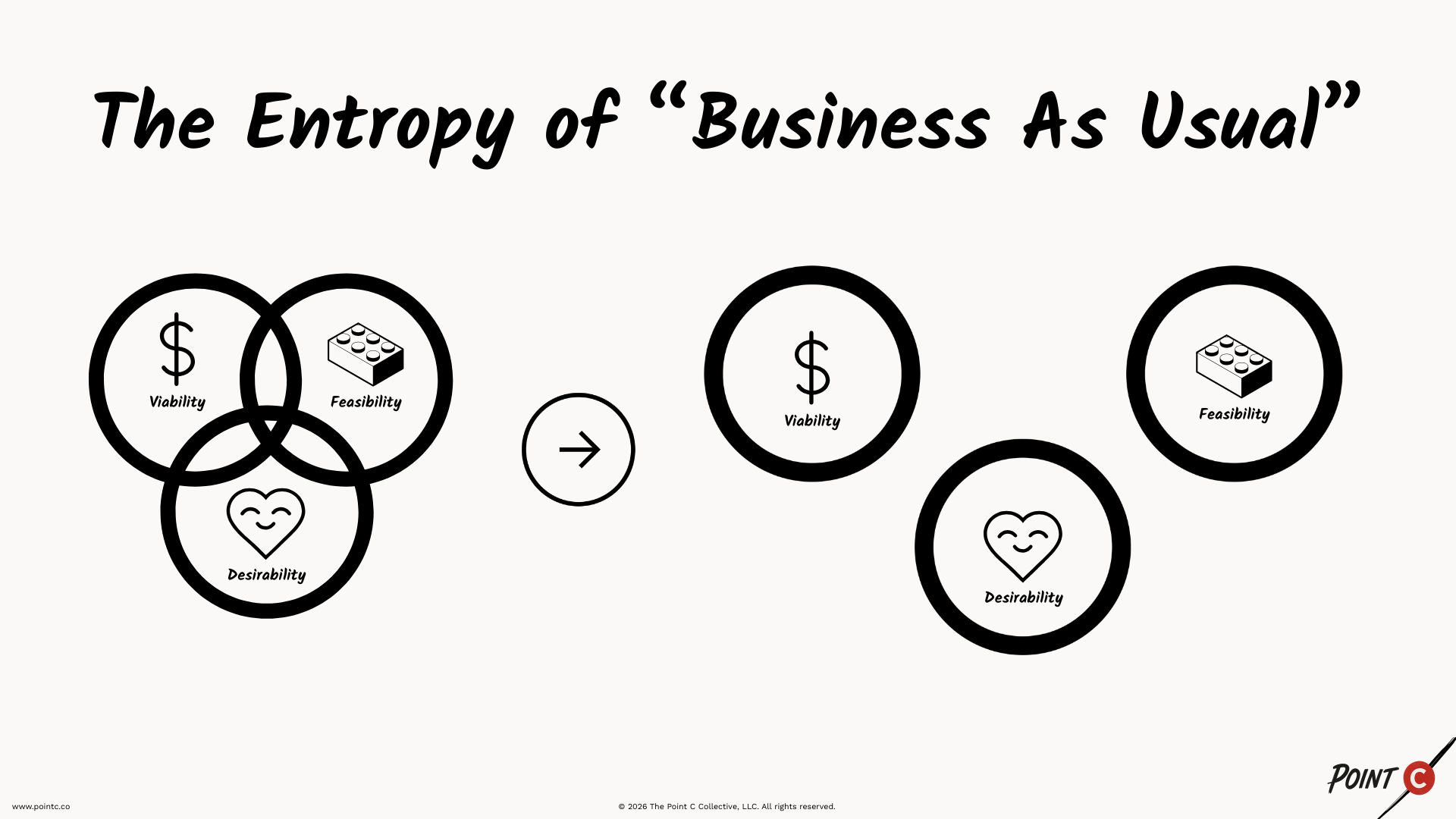 Before they realize it, the company falls out of the innovation sweet spot and it has lost the ability to bring the three rings of desirability, feasibility, and viability back together.