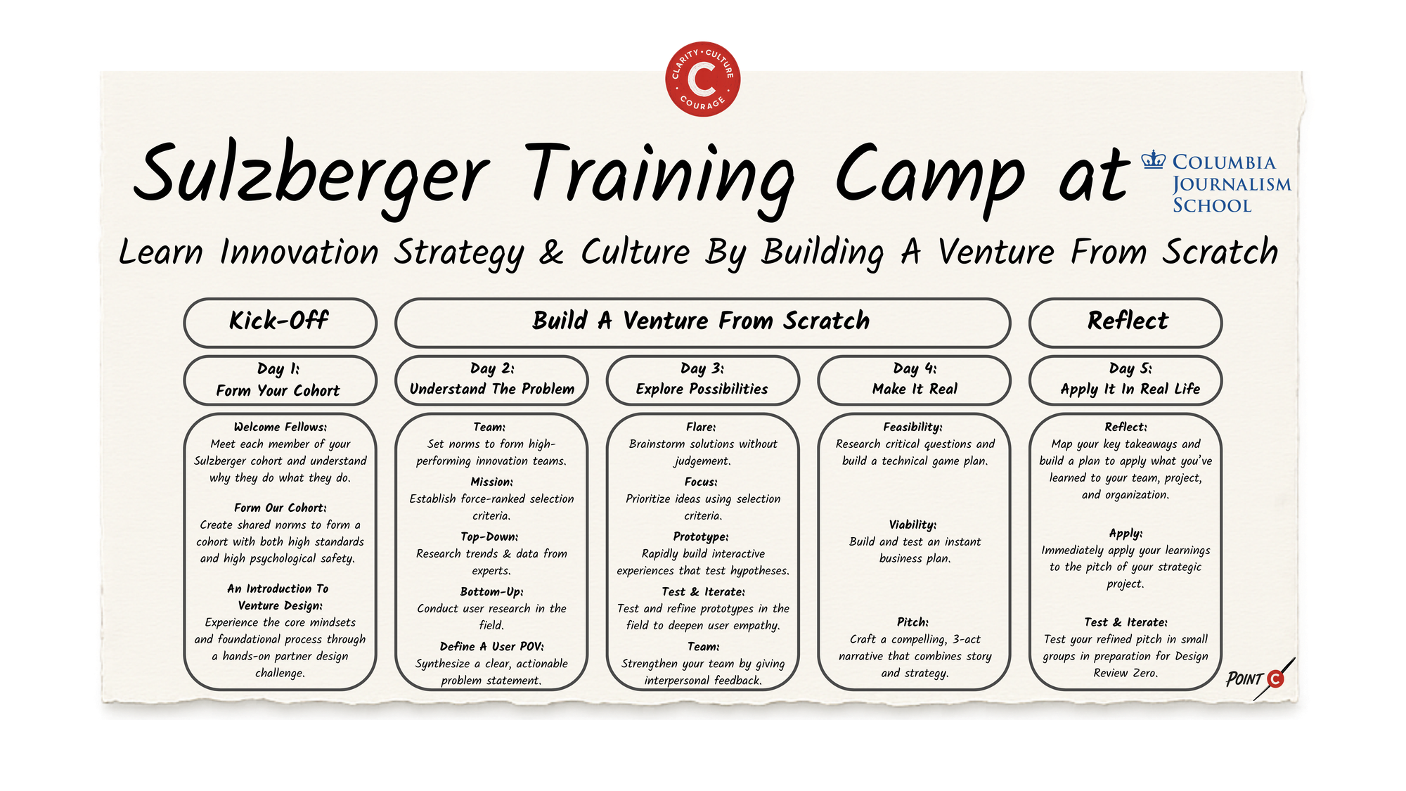The program begins with a five-day immersive project-based Sulzberger Training Camp at our New York City campus. Over the course of the week, fellows form small teams and build a new venture from scratch, learning both the process of building a business as well as the elements that need to come together to make a strategic project successful. This design thinking-based experiential learning also begins to turn a group of strangers into a cohort built on trust and authenticity that extends well beyond the course.